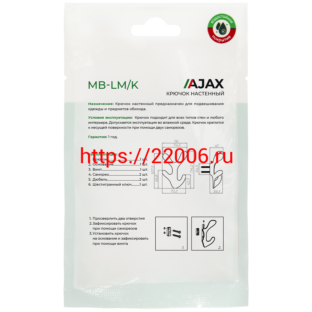 - Крючок Ajax (Аякс) настенный MB-LM/K-005 WH белый в Первоуральске недорого